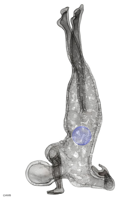 The blue ball you can see in the mesh drawing is free floating. As soon as the virtual drawing becomes a physical sculpture, gravity eefects the model and this ball is falling down into the right shoulder.