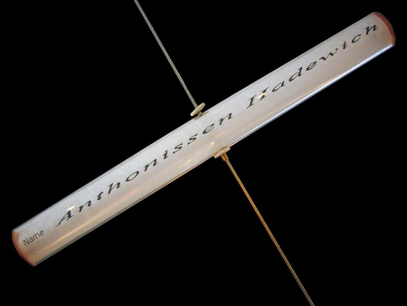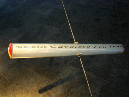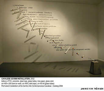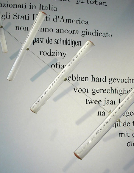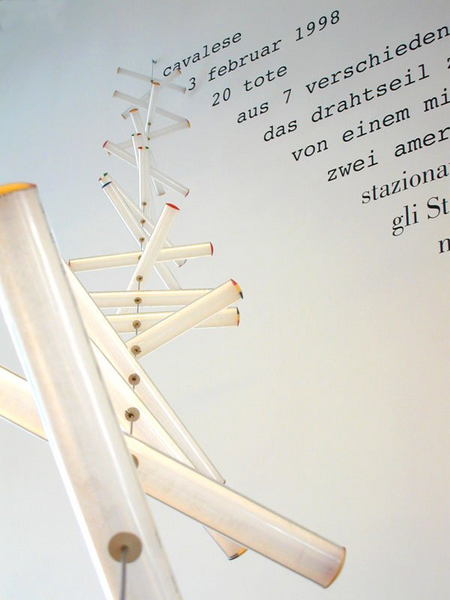 A steel wire stretched from the ground to the wall in an ascending line is dotted with twenty glass tubes, each containing a piece of rice paper. Written on each sheet is the name of a person and the words “Place and date of death Cavalese Feb 1998.” The wire and tubes are accompanied by wall text describing an accident that took place near the small village of Cavalese, Italy in 1998.