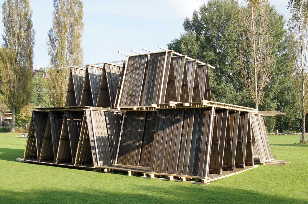 Temporary construction of 200 wodden sun loungers at outdoors pool Marzili, Bern, Switzerland