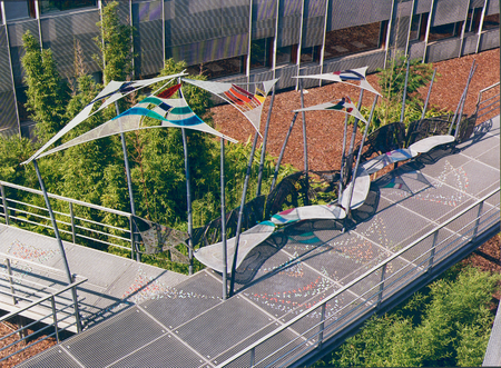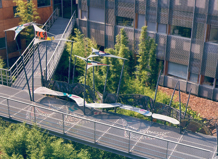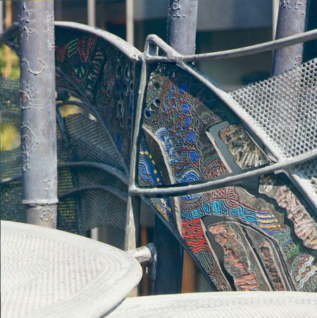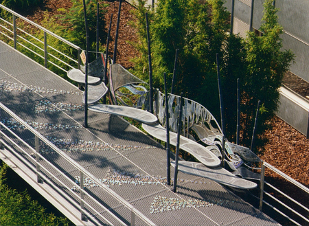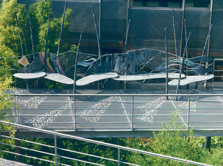 The shades of the little acrylic roofs is made of coloured mosaic in the grid of the bridge.