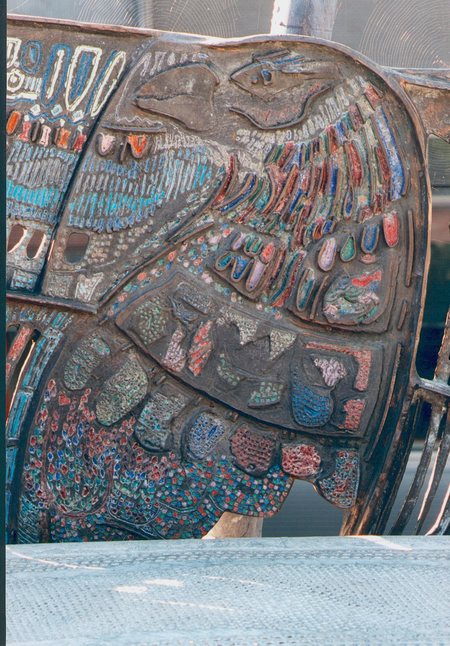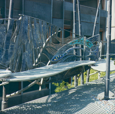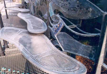 sittingelements in the jungle patio, university of Utrecht. The Poem "Lamento" made bij Remco Campert is written, in welded text, on the iron bamboos in the third part of benches, along the walking bridge. This poem is also made visable in the steel and bronze panels along the sides.