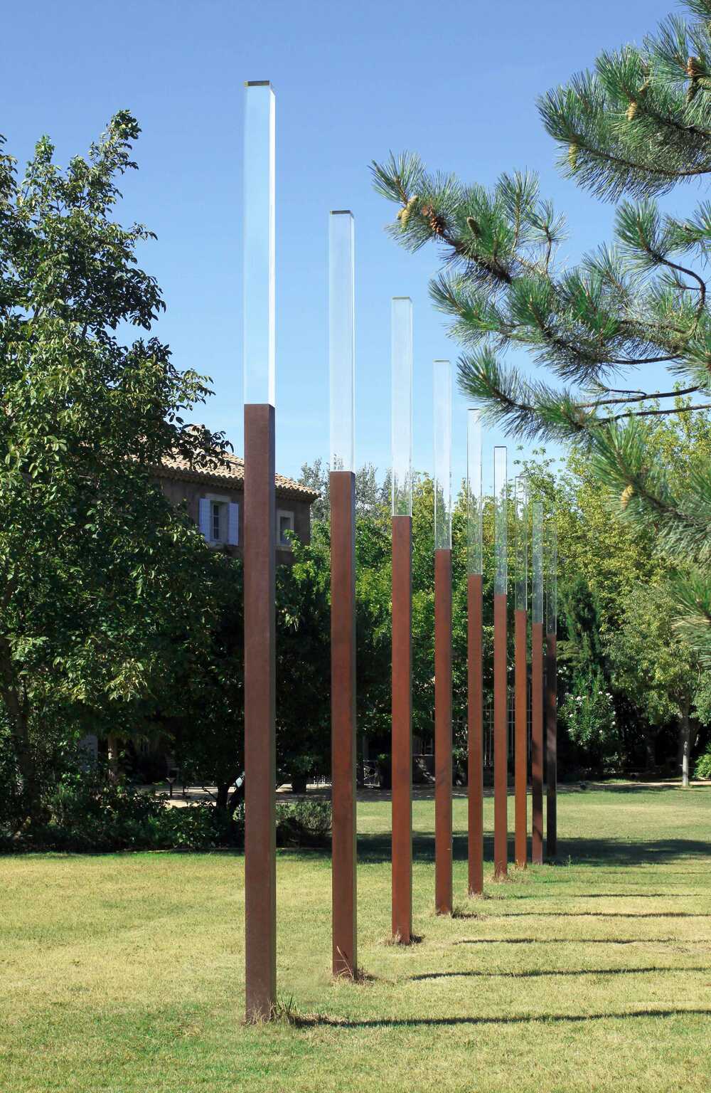 Installation mit 9 Binomen, Ligne Le Thor, Cortenstahl, Plexiglas