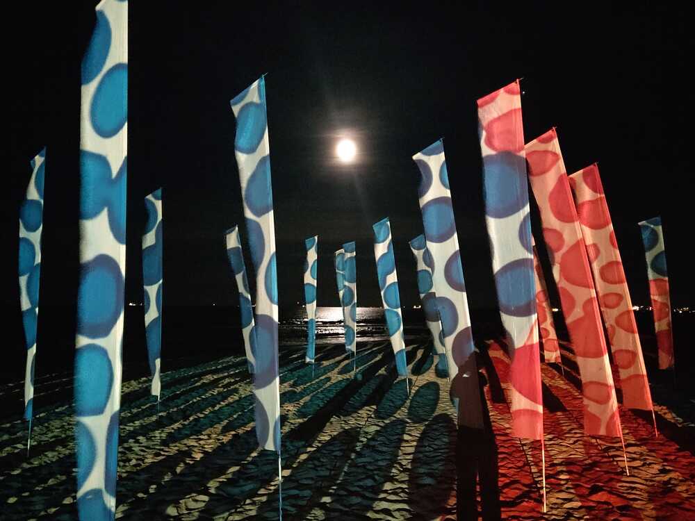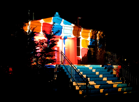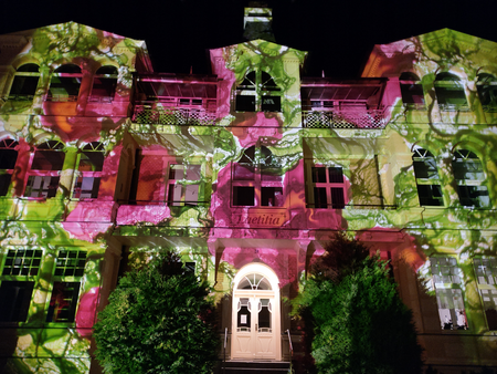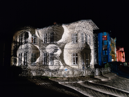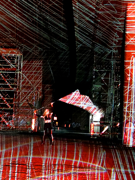 Projektionen bemalter Glasdias auf weiĂe Fahnen, "bewegte Leinwände" und Gebäude.http://wikuku.net/dekompresso.html