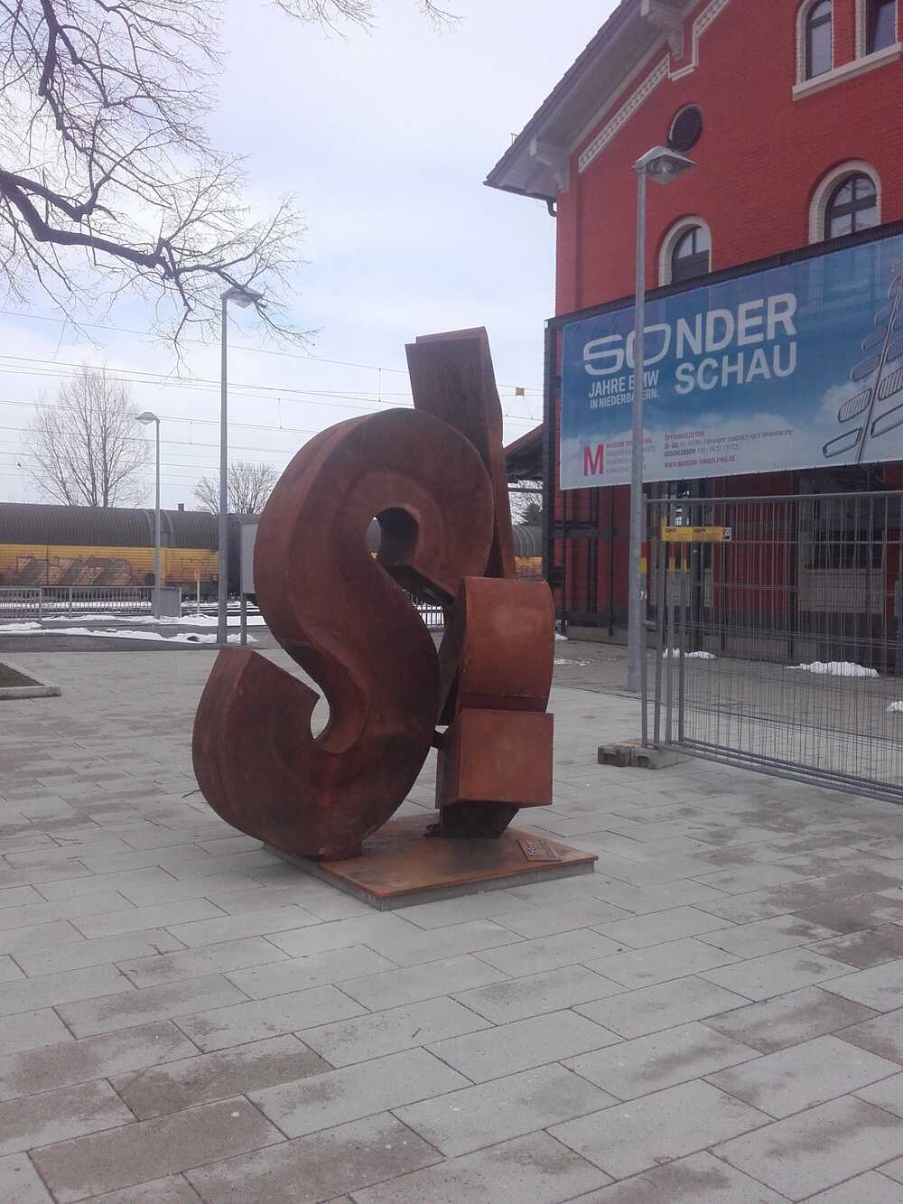 Aus der Serie das "schwebende Alphabet". Auf Öffentl. Grund am Bahnhof der Stadt Dingolfing. Mit dieser Sculptur werden die Spuren der Vergangenheit und auch mögliche Spuren der Zukunft thematisiert. Stahlbuchstaben als Hohlkörper und anschließend unter Vakuum gestellt.