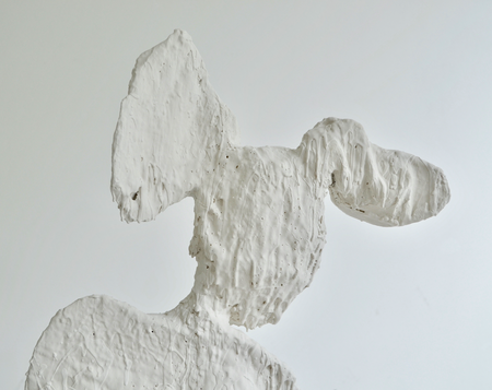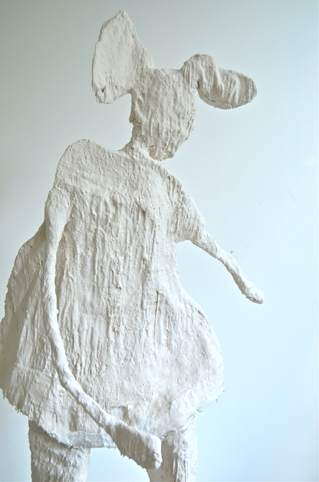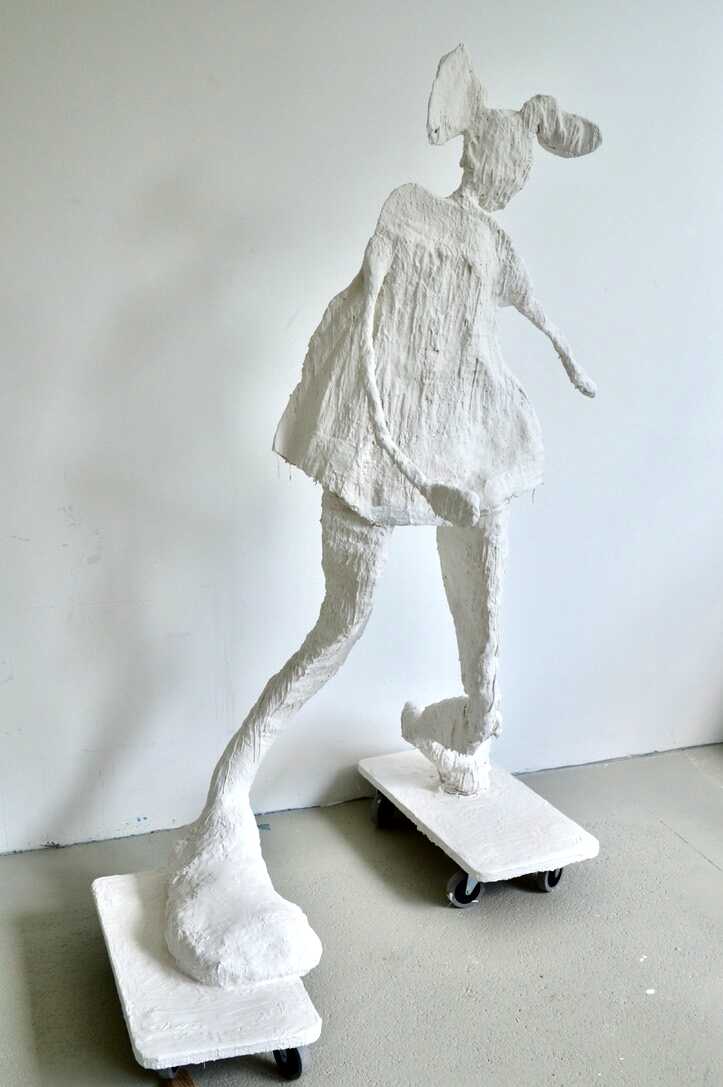 An almost life size sculpture, a woman figure, holding herself up in an almost impossible balance, fixated on a stand on wheels, she shows a very human condition of fragility and courage at the same time.