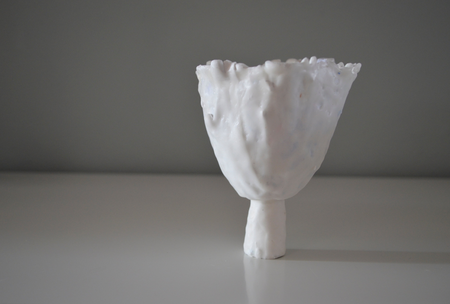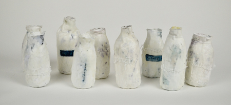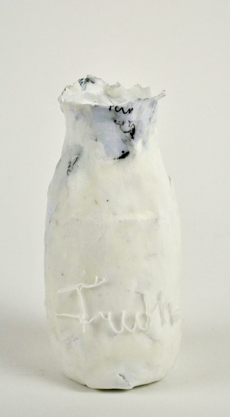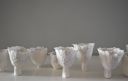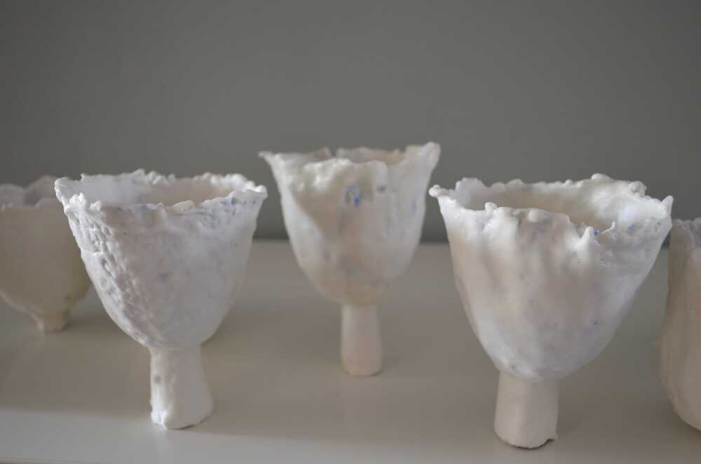 The first layer of the ' journal cups' is papier-mache, made from the pages of the personal diaries of the artist. Additional layers of porcelain-like plaster and beeswax do not totally cover up the writing, but let it shine through. Not the personal feelings of the artist, but our shared universal feelings as human beings are the centre point in this installation.