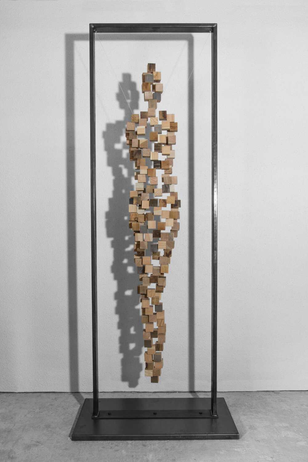 Diese Skulptur entstand aus 157 Lärchenwürfel, die mit Dübeln und Leim miteinander verbunden wurden.