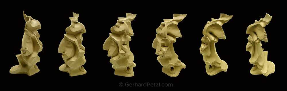 An abstract composition of different heads combined in one sculpture. Depending on the viewing angle various appearances are showing up.