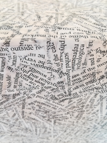 In this work, as well as in "The Question is Never Abut the Truth" the regular arrangement of sentences and words is disrupted. The resulting lack of order or “shredded chaos” is then manipulated in such a way to obtain a new tangible reality, in which chaos and silence cease to function as binary opposites. Chaos and silence become symbiotic and are dependent on one another. My aim, with these projects, is to explore the unknown realms between language and not-language, between communication (and its chaos causing misunderstandings), and silence (the chaos of the unsaid). In this context, chaos can be seen as a constitutive element of signs production in both language and silence. Silence is often seen as the reverse of language, however silence is an integral part of language, as not only does it divide and link sentences, but it is also to be found inside of them and is, furthermore, inhabited by them as well.