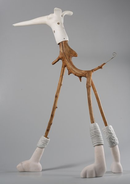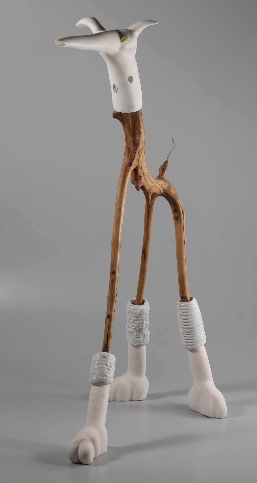Olive wood from my own trees, Carrara Satuario Marble, Pink Portuguese Marble. When I trim my olive trees, I'm always looking for branches which might form the basis for a good sculpture. I leave the wood outside for at least 3 years, so the bark comes off by itself, leaving a rich surface on the wood. Then I create the marble to complete the figure.