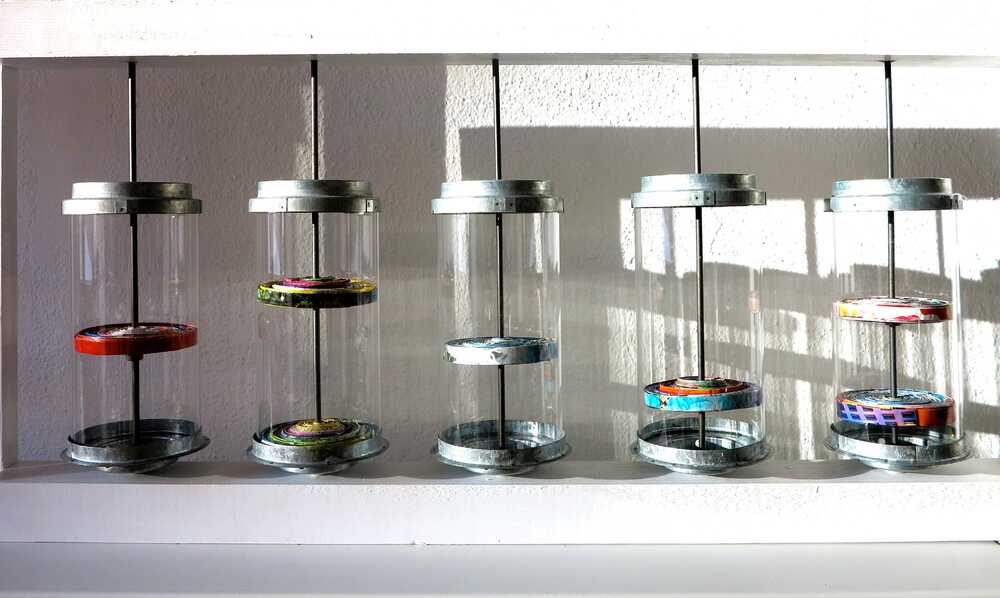 Alltagspapier gefaltet, geklebt, gerollt in Gebetsmühlen aus Glas