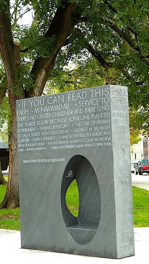 theme of honoring Public Servants/Service. 14 quotes by various public service notables about public service,engraved on the stone: one must walk round the stone to read them. 2 seats that are inter-connected, so the seated may communicate thru the stone wall and hold hands.