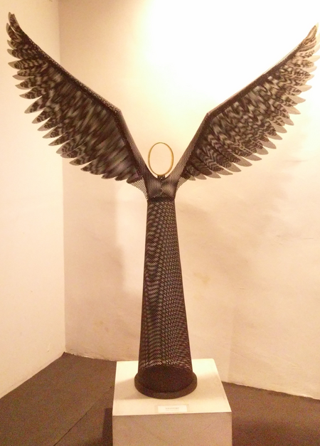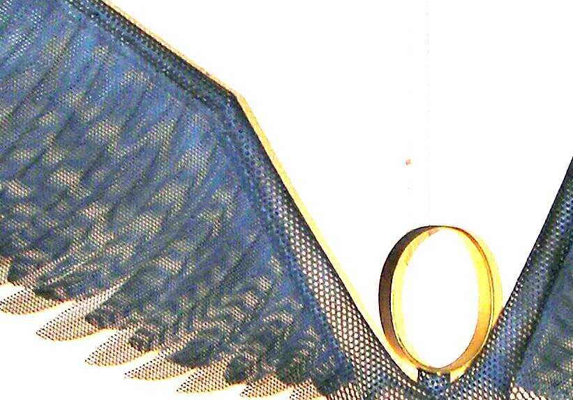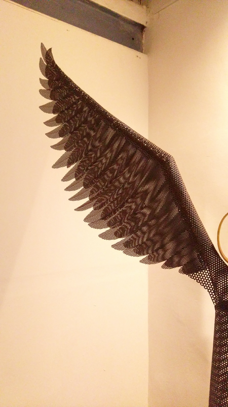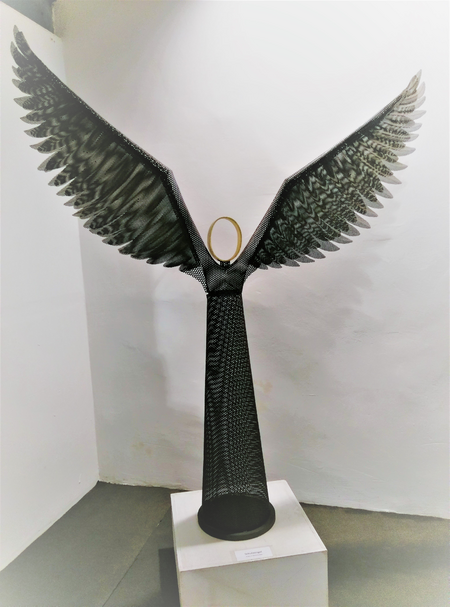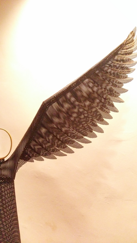 Aus Lochblech getriebener Engel. Durch die eigene Bewegung entsteht ein Moiré-Effekt der die Flügel mit seiner Federstruktur zum Leben erweckt.