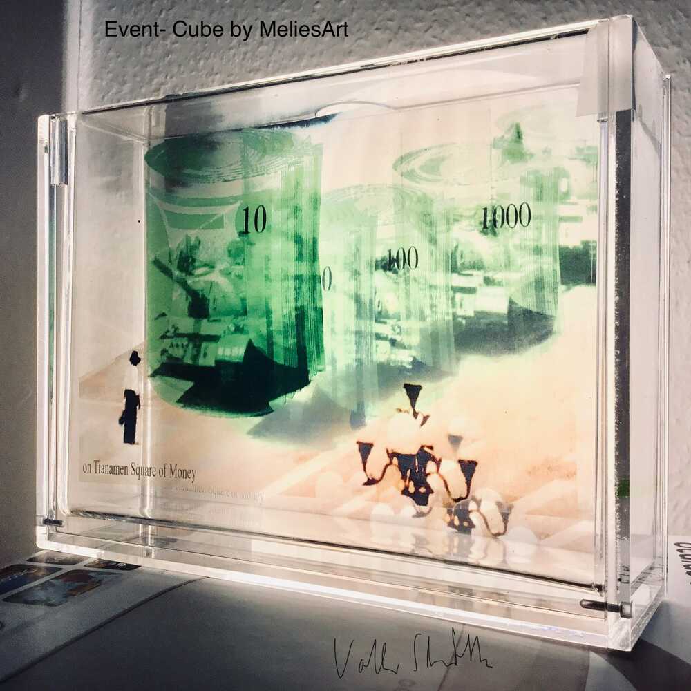 Acyrlglas- Box mit zwei Folien. Mann vor überdimensionalen Geldschein- Rollen, durch die Panzer schimmern