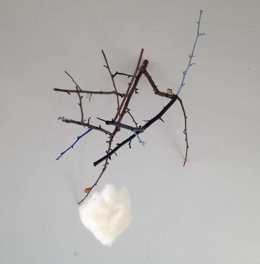 wool, tree branch, glass, paint.