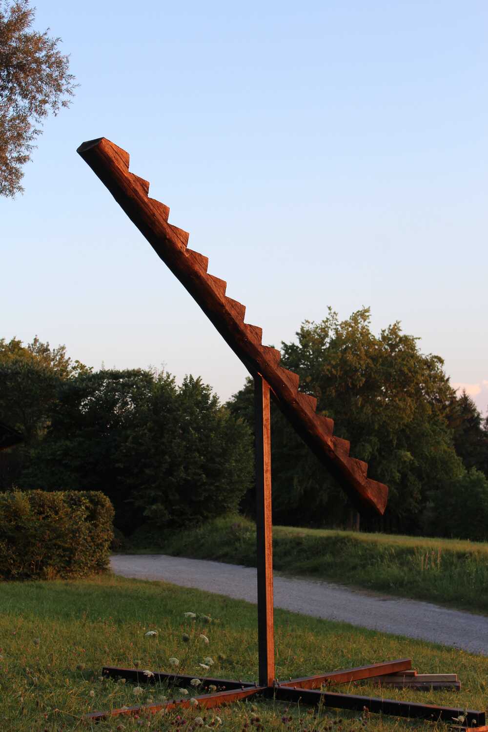 Verkohlte Treppe aus Tannenholz in die Höhe gehalen von einem Stahlgestell