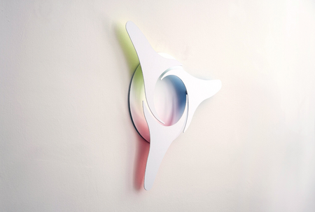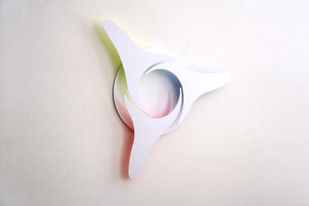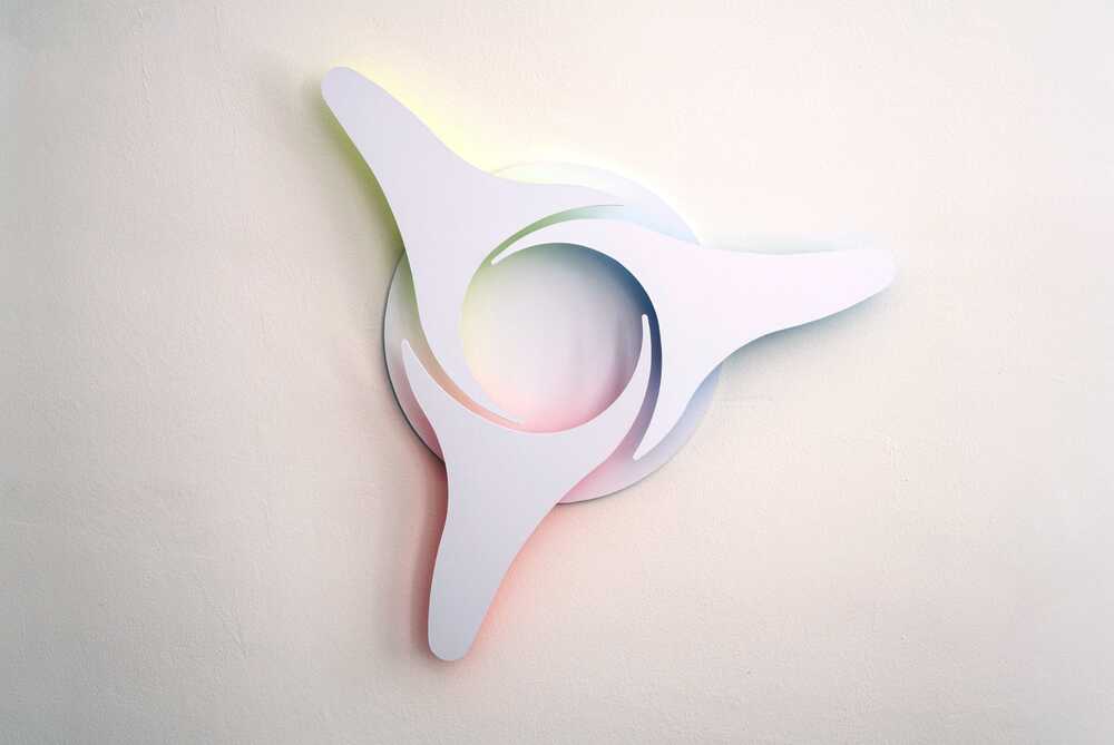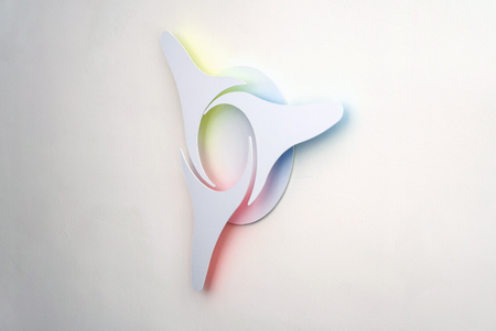 Like three spokes of a wheel or rays of a star, the three basic colors blue, yellow and red strive for a common dance on the round background disc. Outside the disc, each one by itself, they mix to a seemingly rotating color wheel.
