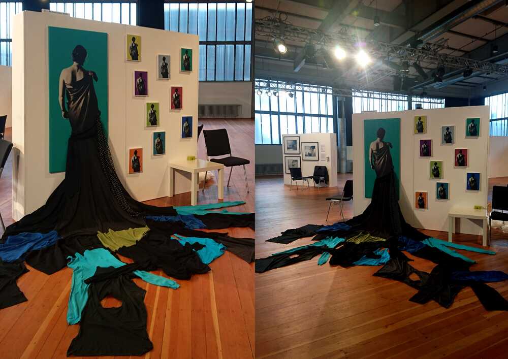 A wall installation about the fast fashion industry and its waste of resources.