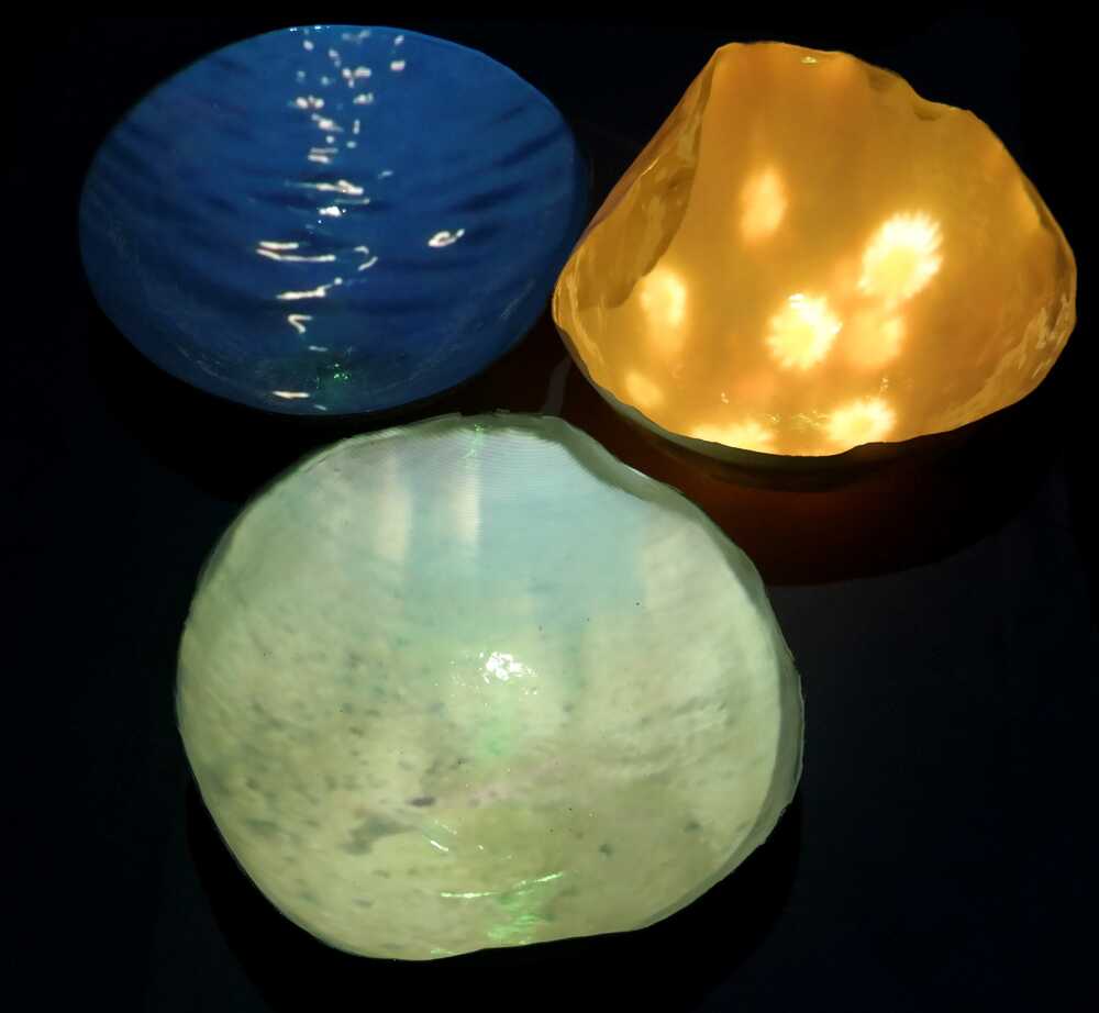 videomapping installation of three porcelain bowls, 40 cm average,25 cm height,