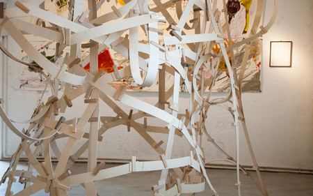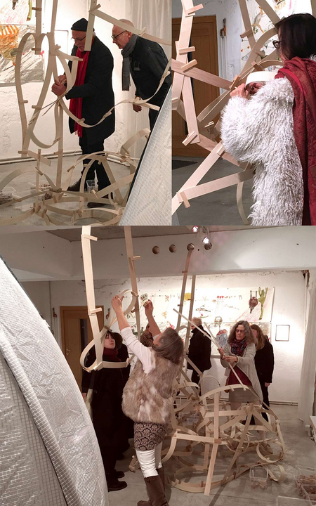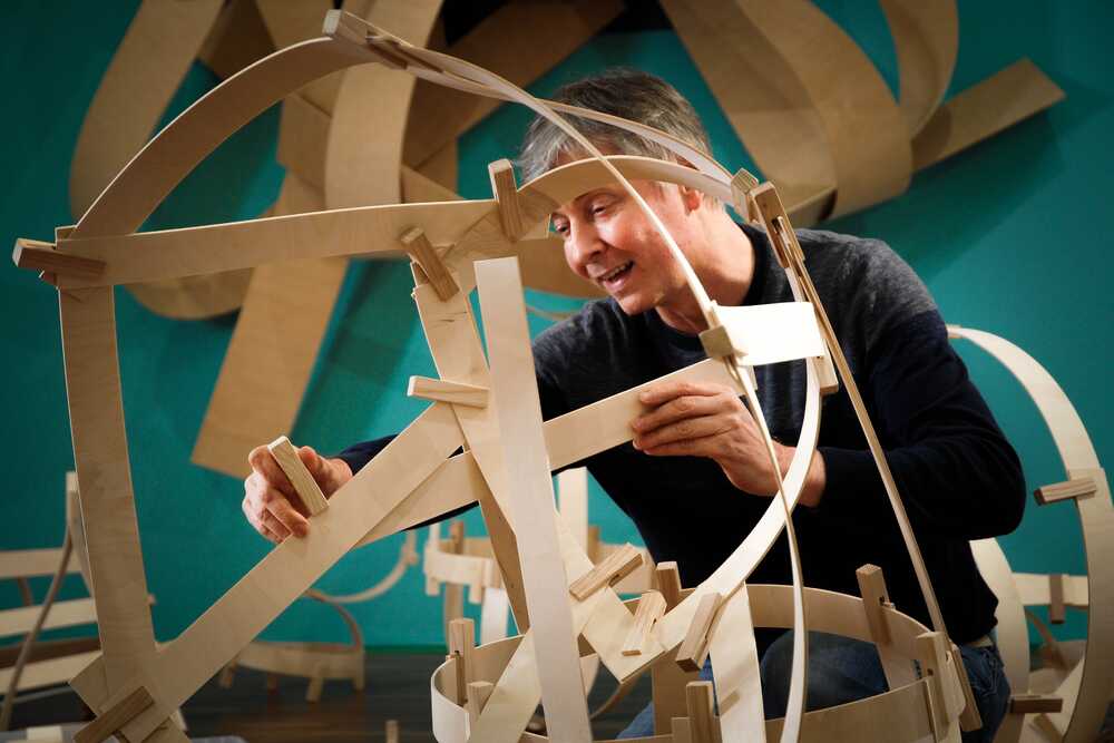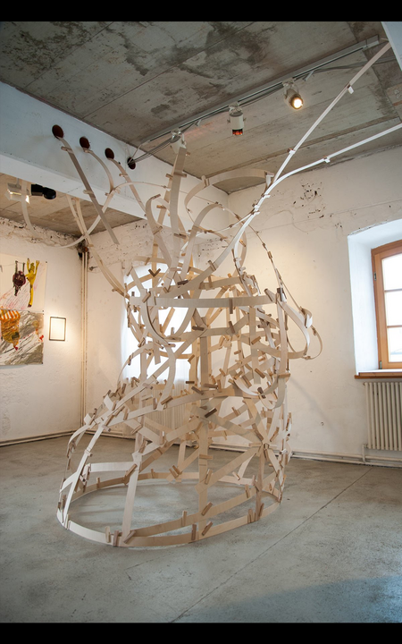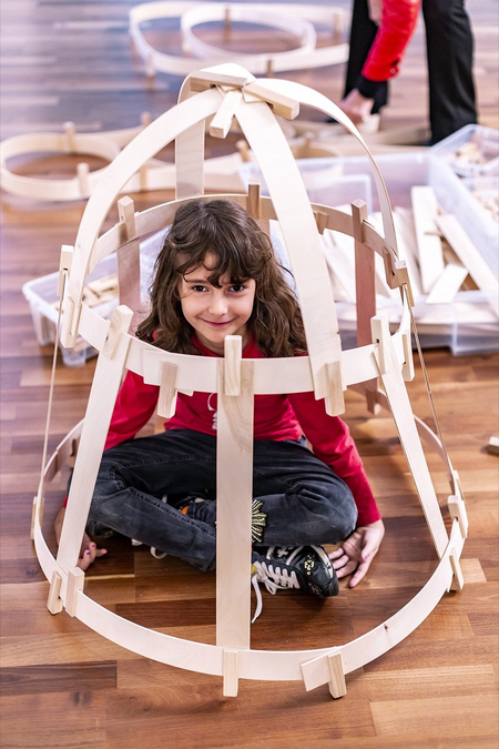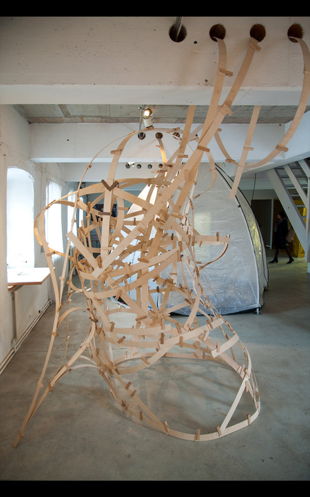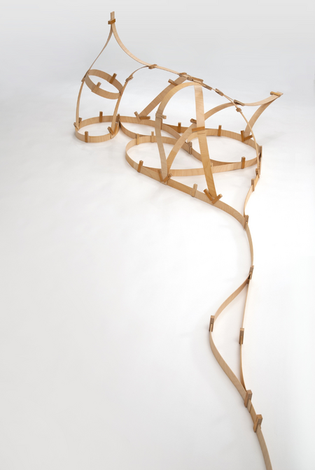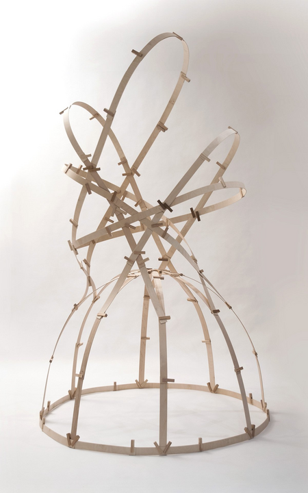 The strips of wood are joined together with wooden clips, which causes emerging tensions (ideal) forms to emerge as if by themselves.