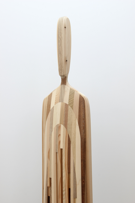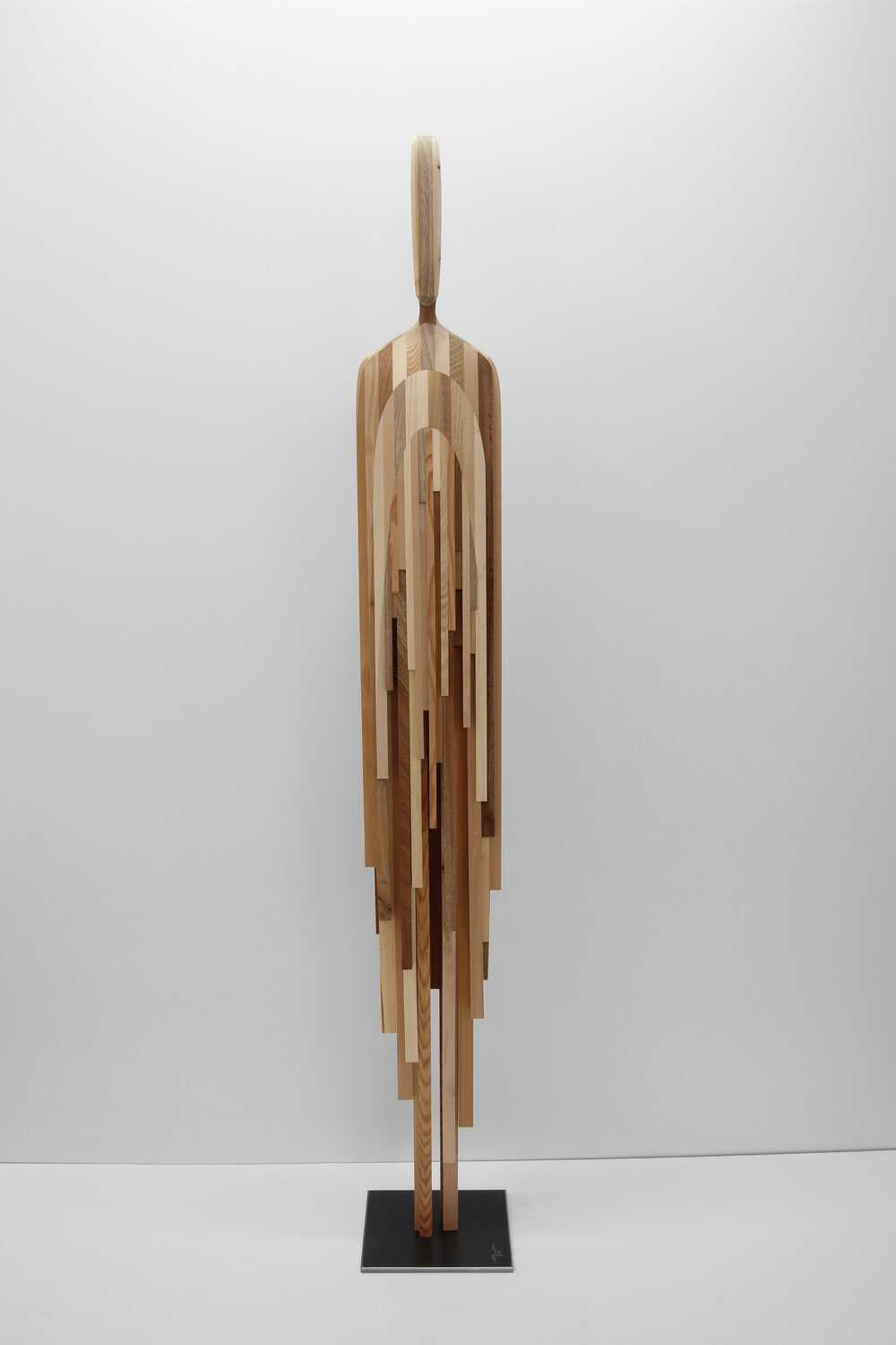 Die Skulptur „human flow DIONE“ entstand durch ein aufwendiges Verfahren aus vielen einzelnen Holzleisten und insgesamt 9 unterschiedlicher Holzarten.
