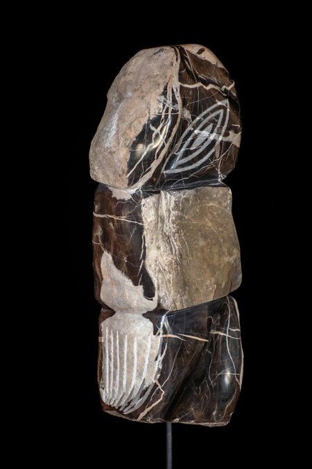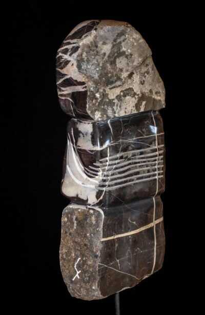 In einem Vorarlberger Bachbett habe ich diesen Kalkstein gefunden und bearbeitet. Jede Seite hat einen rohen Teil und einen glatten, bearbeiteten und mit Kerben versehenen Teil --- so wie ein "richtiger Vorarlberger" (ghöriga Xiberger) eben ist!