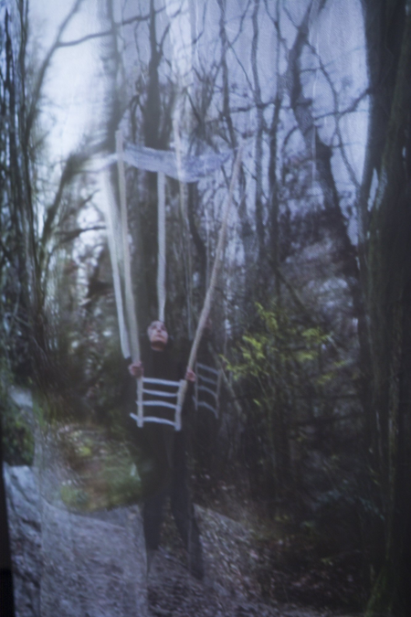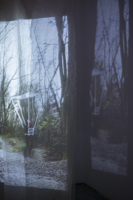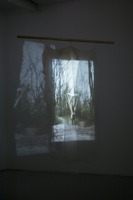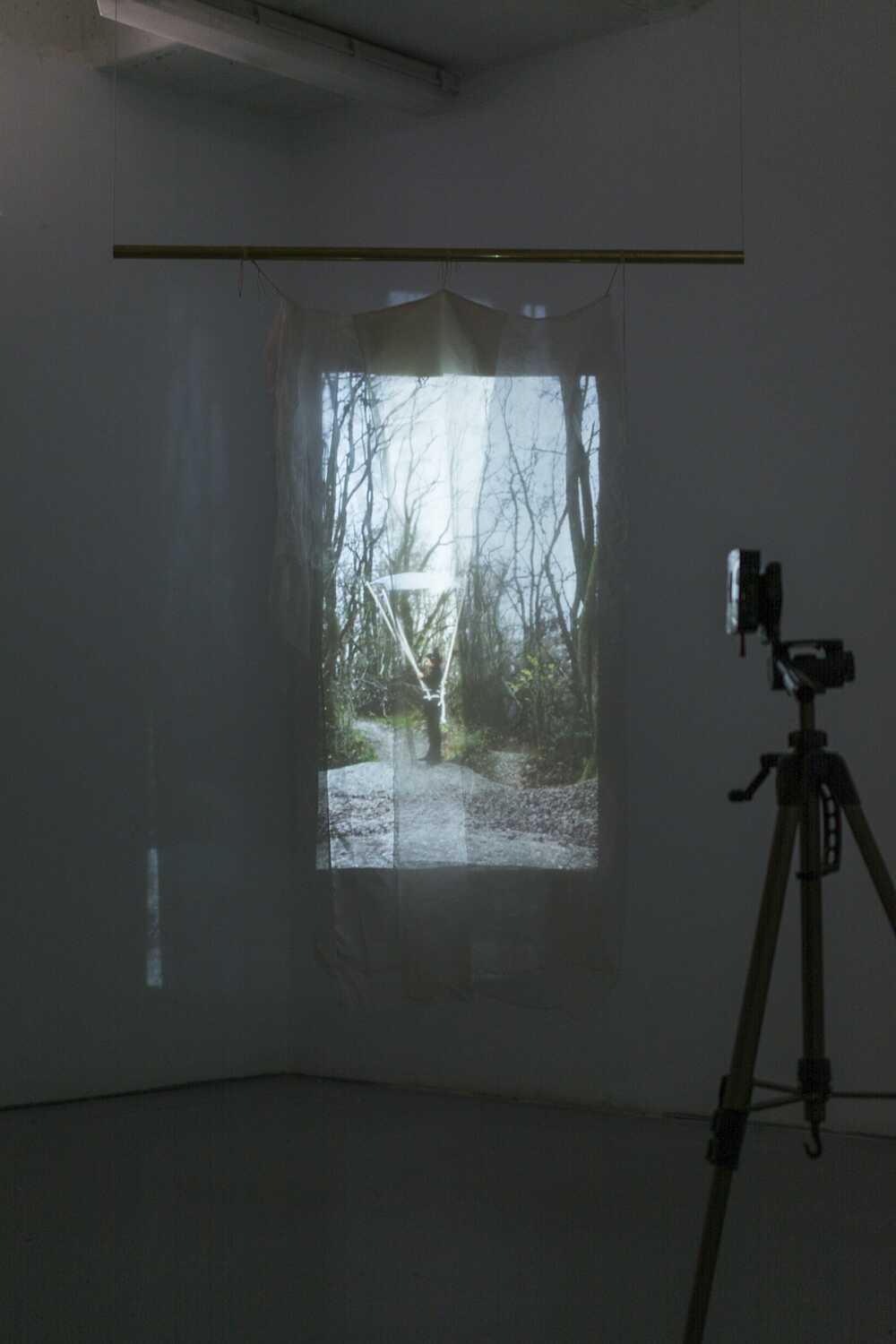 The video-performance is projected on layers and layers of silk of different textures. This silk interlining is hung over a brass tube which in turn is hung from the ceiling. The layers of silk give the moving image a three-dimensionality by fragmenting the image and replicating it in the different dimensions expanding its reflection.