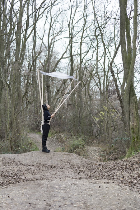 The project “Dreaming the Forest” speaks of the ephemeral experience of standing in front of a tree; of the incorporeal experience of remembering nature. The third piece in the series is a video installation, in which you can see a body with a body artifact that helps to remember the living forest, the action takes place in a skeletal landscape desolated by the cold. This piece talks about the memory of the forest. The work is a contact with the earth, a connection with nature that is evoked by the music of the wind.