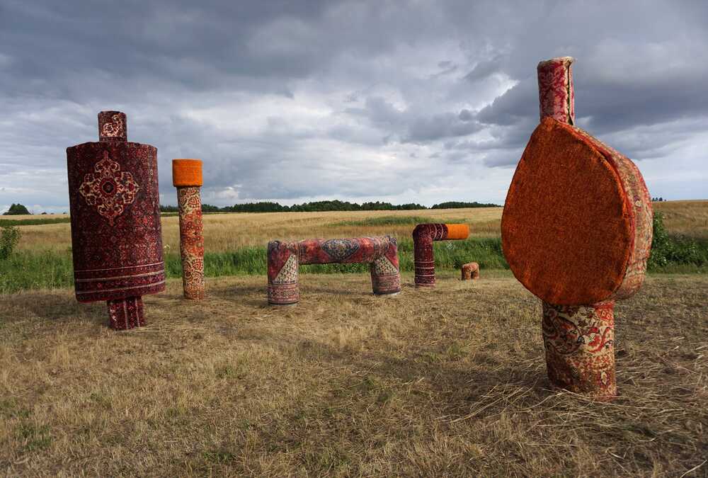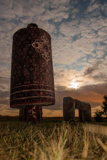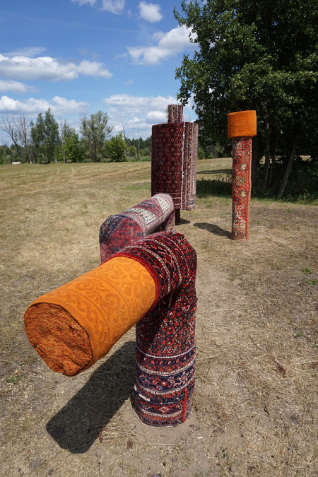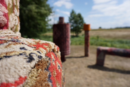 These industrial shapes get a homely appearance because of being covered in traditional carpets. The carpet designs refer to gardens and plants. At the same time the European landscape/nature as a whole is designed and man made. The artwork plays with the double bind of being dependend on these industrial presences and our loathing of them