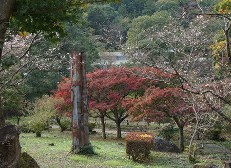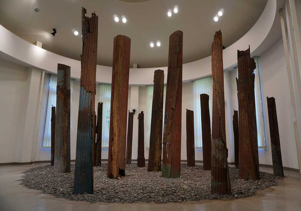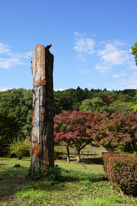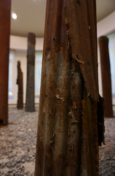 The materials used industrially now returned symbolically and physically to the nature they came from. Trees in a forest carry a certain energy and their purpose is simply to grow, to live, and the industrial structures we build are ever as temprary as nature's. So the seemingly incongruous juxtaposition of corrugated metal trees in a forest position, question the relation between the human and natural, and even makes us question what is 'real'.