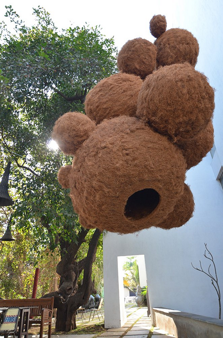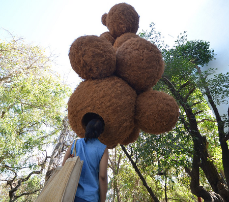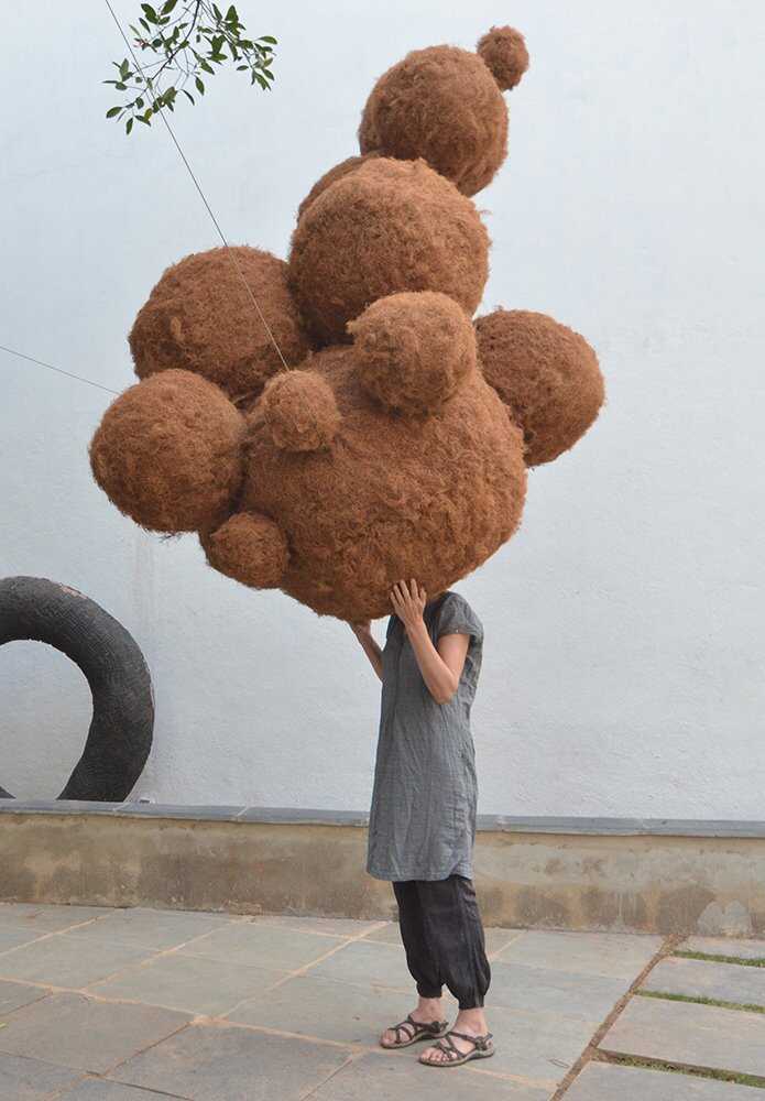When thinking we are hardly aware of the environment, we are closed in our mindbubble. When you put your head in this coconut fibre sculpture, the world is dark, soft and lonesome.