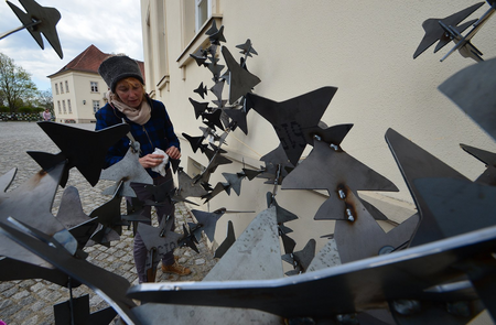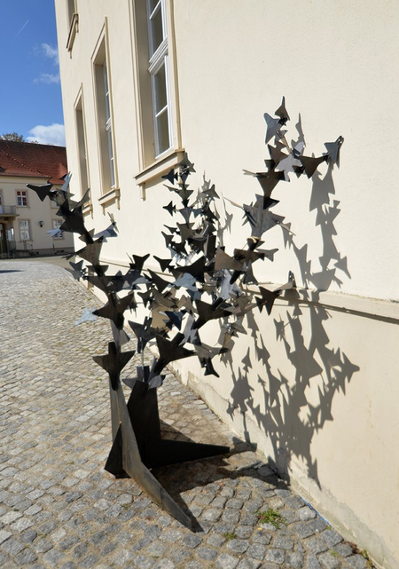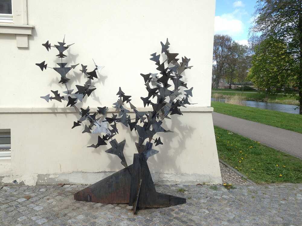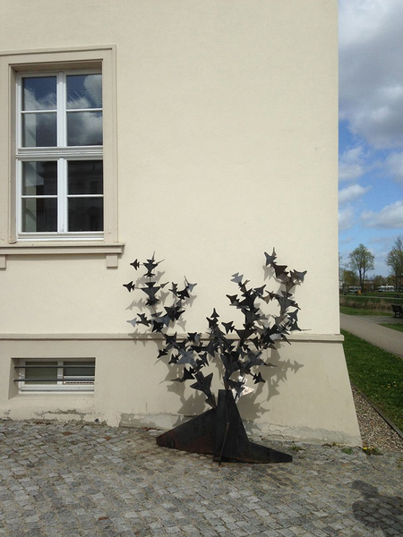 This corten steel sculpture is inspired by the real existing plant Colletia Paradoxa, consisting of little airplane wings. It is a prickly plant and so are airplanes in our world, very convenient but displaying inconvenient effects on nature.