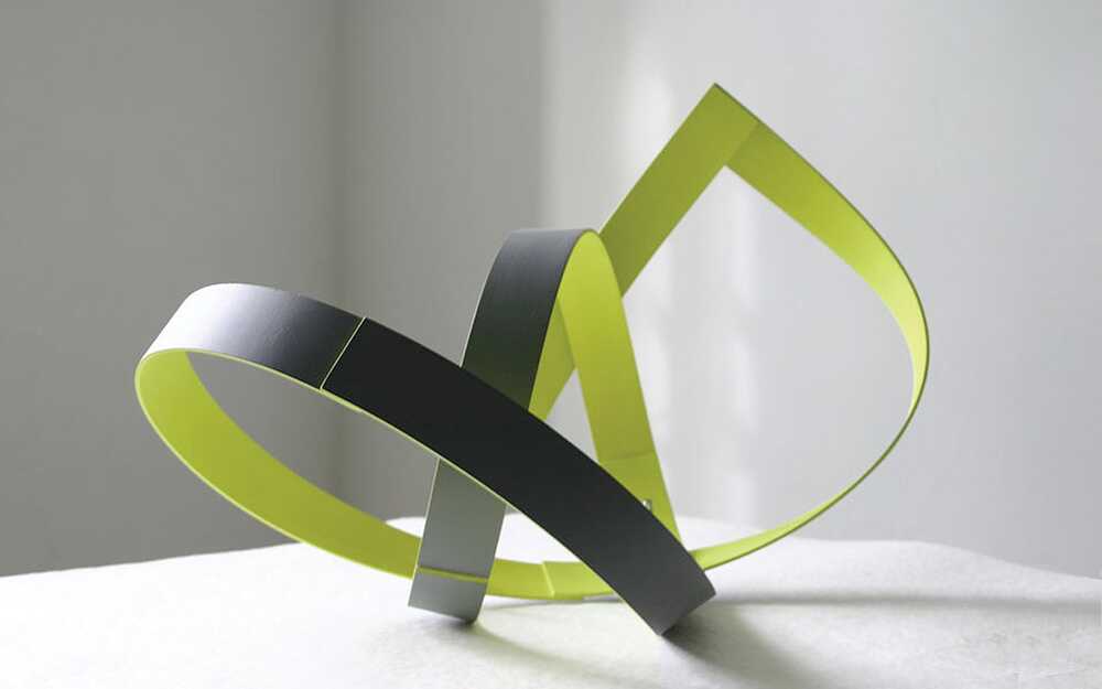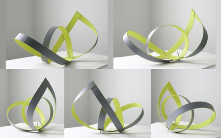Die einzelnen Streifen werden zu einem langen Streifen verbunden, dann verdreht und die beiden Enden im 90° Winkel befestigt. So entsteht eine äußerst spannungsvolle Plastik.
