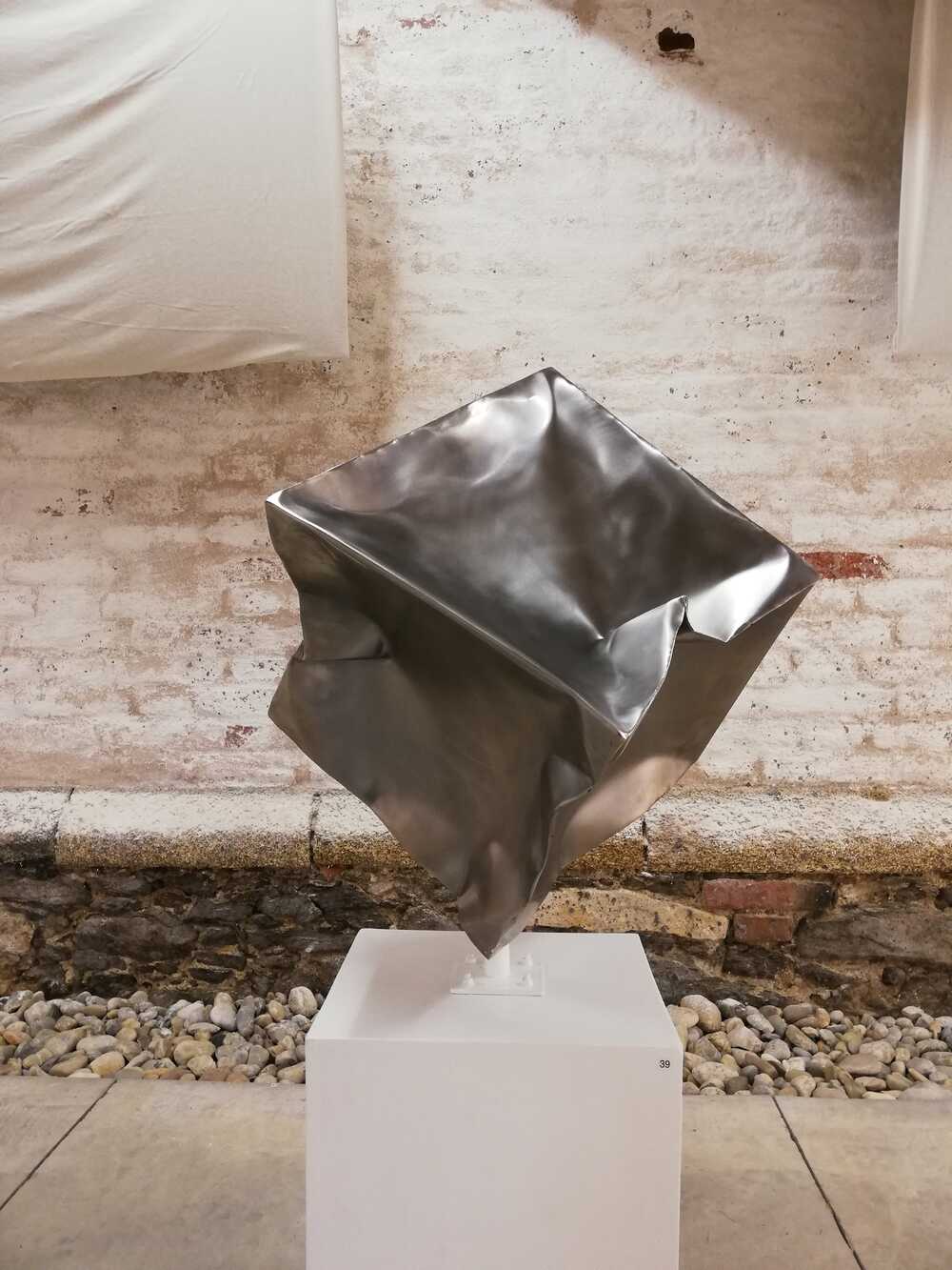 Edelstahlwürfel aus der Werkreihe "Vakuum-Projekt". Die Technik der Bearbeitung von zu vor exakt gefertigten Objekten, mit anschließend unter Verwendung einer Vakuumpumpe verformten Körper. Macht doch diese Technik die große Kraft der Natur sichtbar, der wir Menschen mit unserer Körperkraft nichts entgegenzusetzen vermögen.