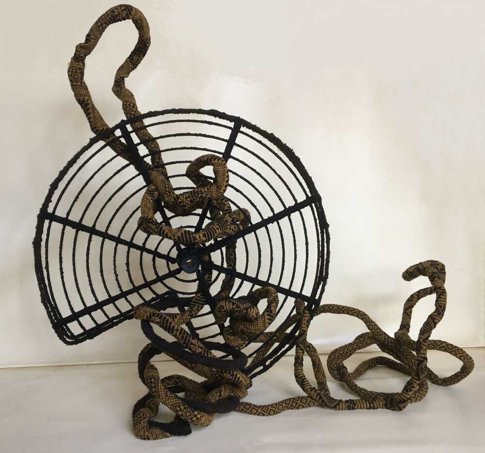 A discarded metal kitchen part is completely crocheted with brown wool. A long brown and black wired fabric snake approaches the frame and climbs up it.