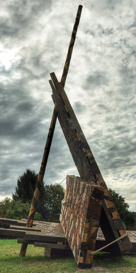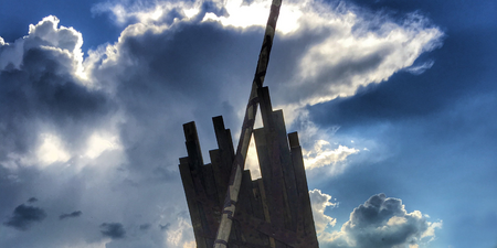 Aktions-Skulptur aus Holzbalken, Schmiedenägel, Blechstreifen. Performance in Zusammenarbeit mit über 100 Geflüchteten aus unterschiedlichen Teilen der Welt.