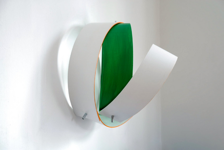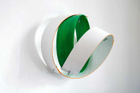 The cool plain white stripes with the orange thin edges contrast to the green stripes which gives the sculpture a fresh and dynamic expression.