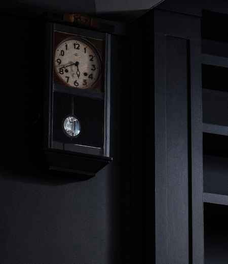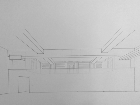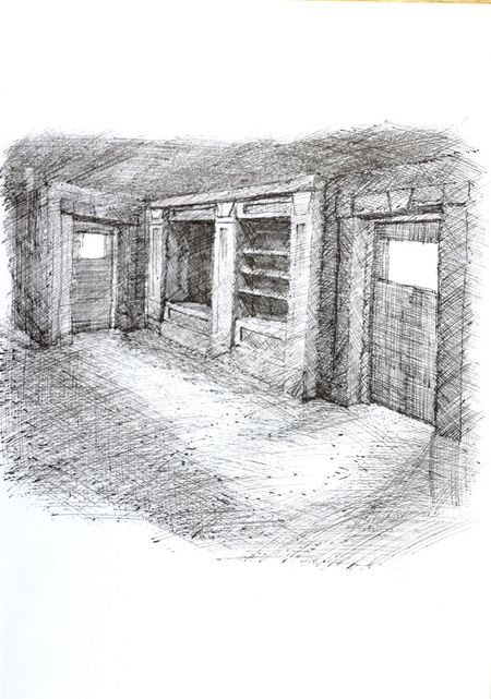 At the back of the gallery space, atop a 200cm high wall, is an empty library. Occasionally the lights behind the doors flicker on, as if someone is passing unseen in unknown corridors. The only light aside from this comes from the two fire exit signs, that cast a grenn glow over the abandoned space. There is no access to this library, its knowledge is forgotten.