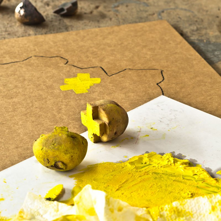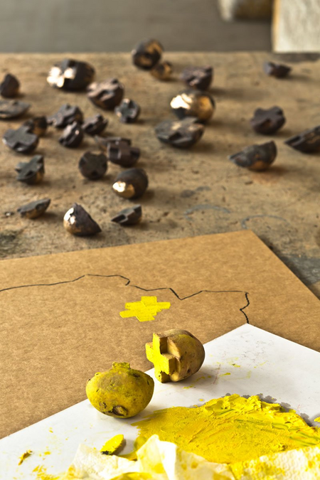Installation, bronze/wood/cardboard/steel/potato/colour