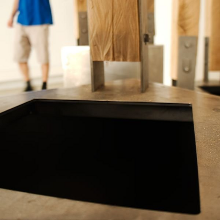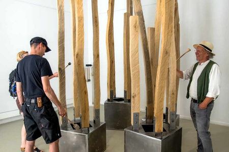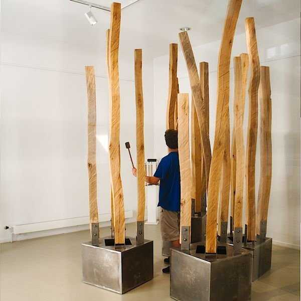 Auf einem Stahlblechwürfel mit einem nach oben gerichteten Schallloch sind jeweils ca. 4 Eichenholzstäbe als Klangstab montiert. Der als Basis wirkende Kubus tritt in seiner Erscheinung zurück, wirkt aber als Resonanzkörper, der auch anschlagen werden kann. Die darauf montierten, mit der Kettensäge vierkantig geschnittenen und strukturierten Klangstäbe zeihen durch ihre geschwungenen Formen die visuelle Aufmerksamkeit auf sich.