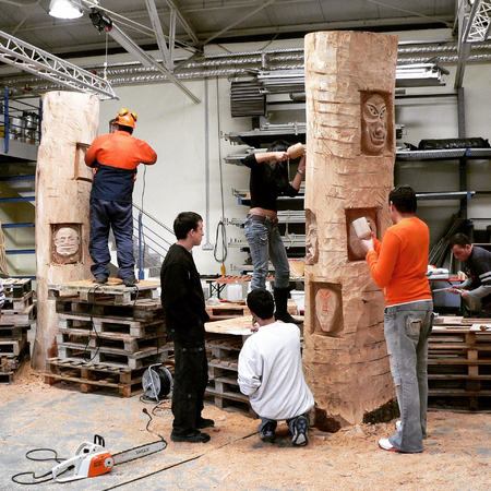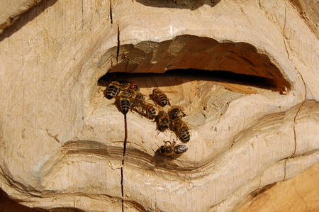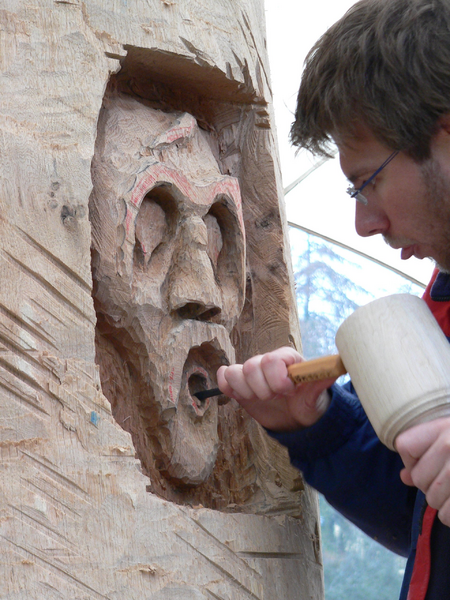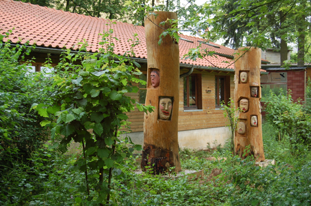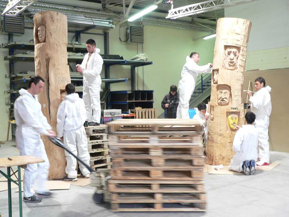 Projekt Paradies in Luxemburg, Burg Hollenfels, Jugendliche mit Kriegserfahrung sind gefragt dem Bösen ein Gesicht zu geben. Es wird modelliert und 1:1 in den Bannbaum gesetzt. Bannbäume sind von Bienen bewohnt und haben das Böse zu bannen, denn wer will nicht alles an den süßen Honig? Diese Bäume sind dann mit Bienen besetzt worden und stehen nun in der Demeter-Imkerei von Michel Collette