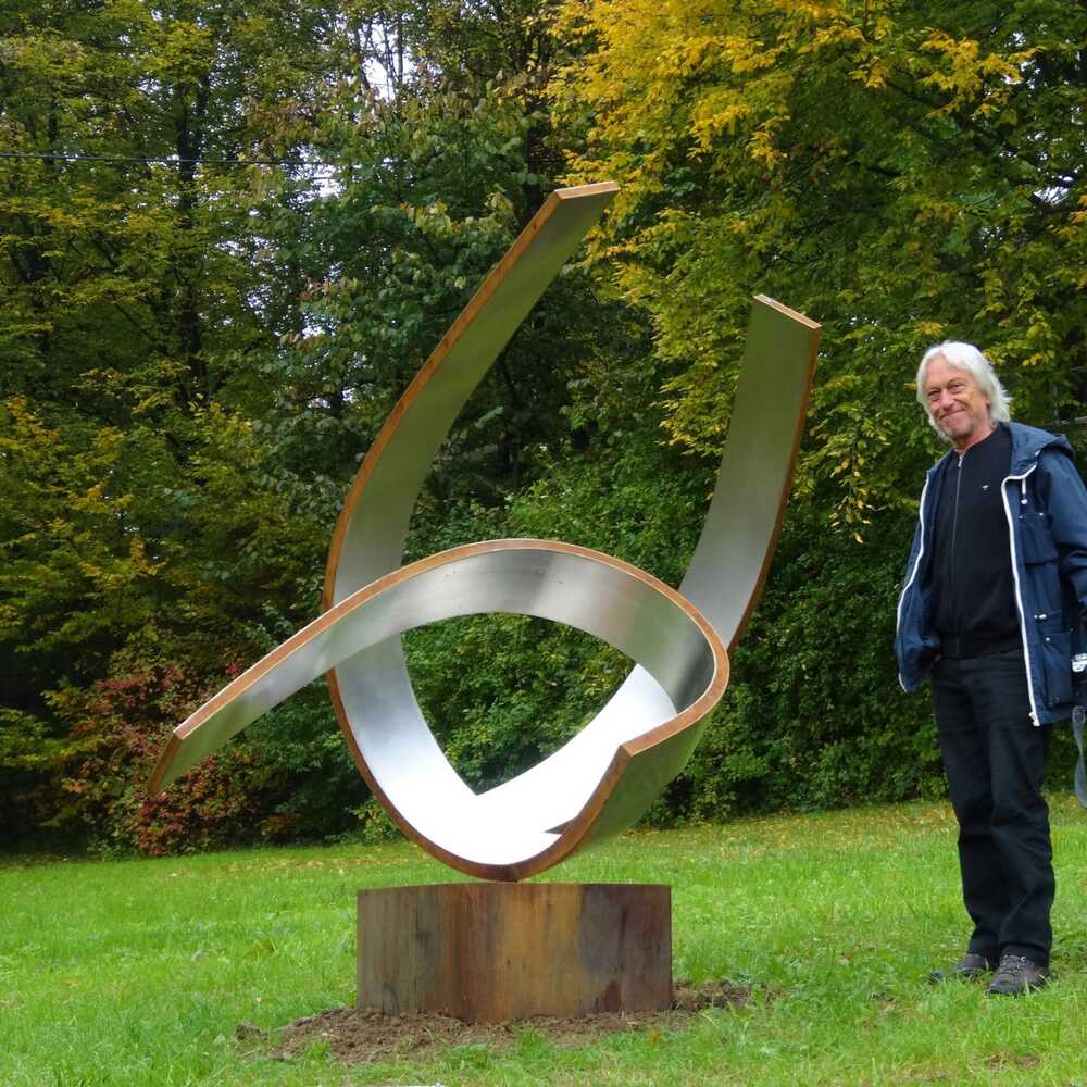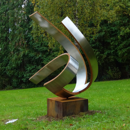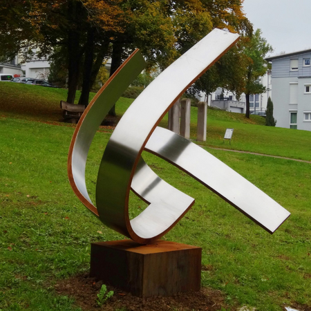 Stahlskulptur für den Krügerpark in Eningen unter Achalm, Auftragsarbeit für die Gemeinde Eningen. Kombination aus gerostetem Corten-Stahl und Edelstahl. Hohlkörper nahtgeschweißt.