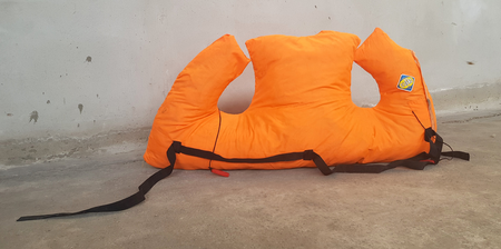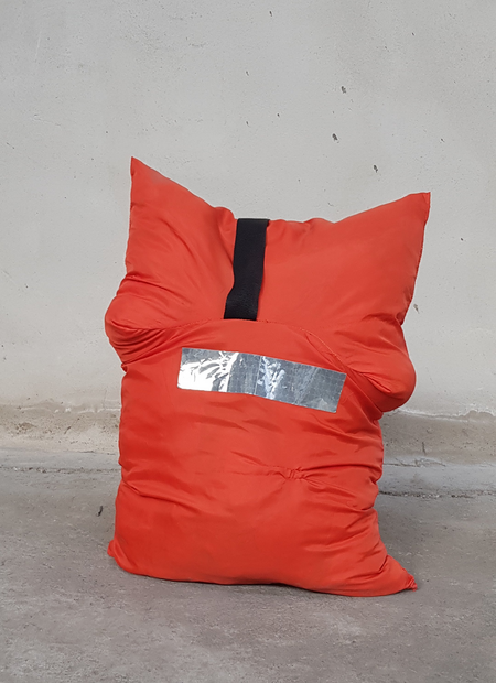 The original shape of the vest has been sewn together in a new way and filled with plastic bags.