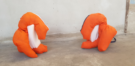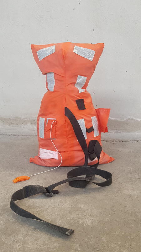 Alienation (hang man) is made from used and discarded life saving vests.