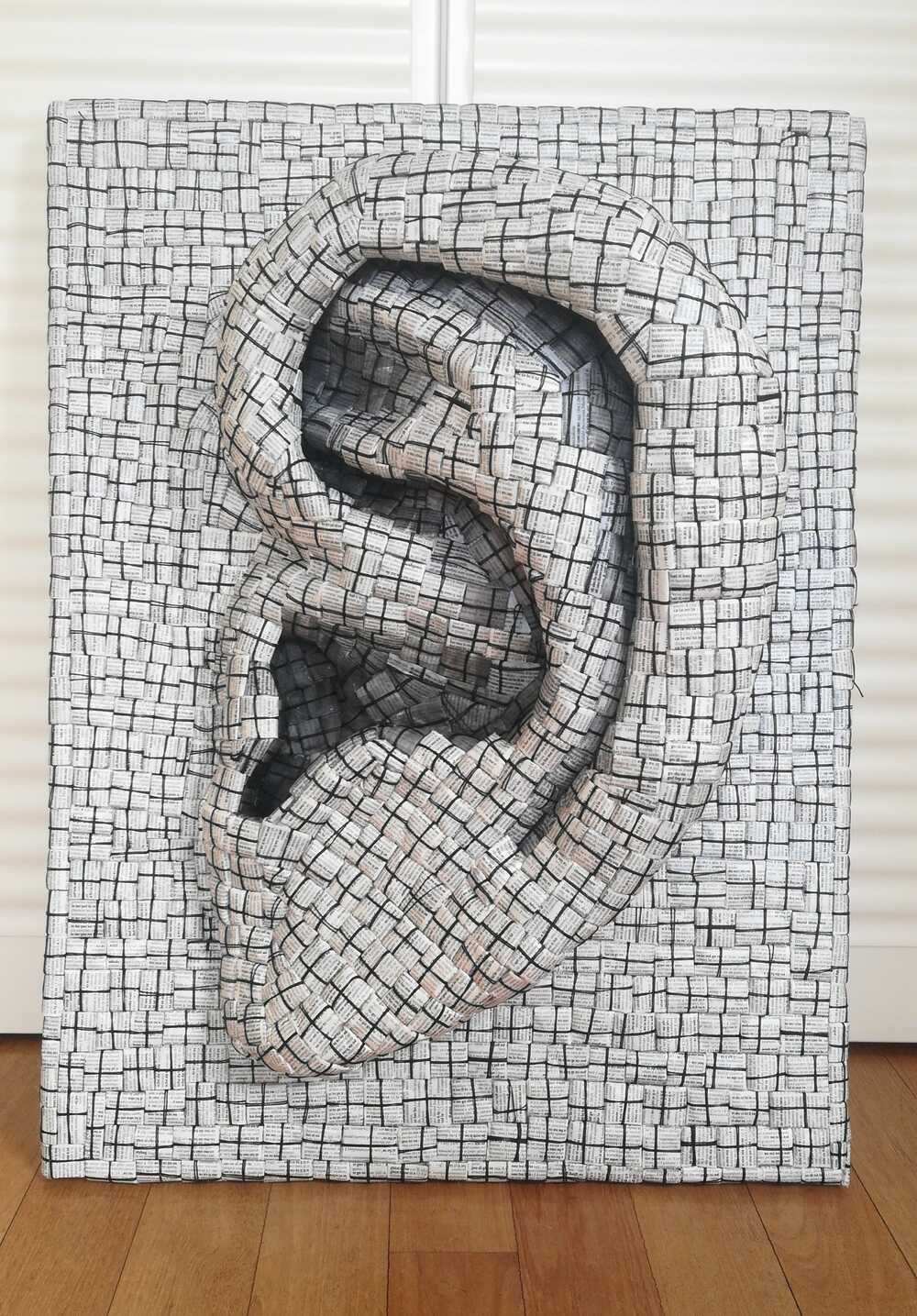 This ear is made of parcels of the pages of an Italian dictionary.