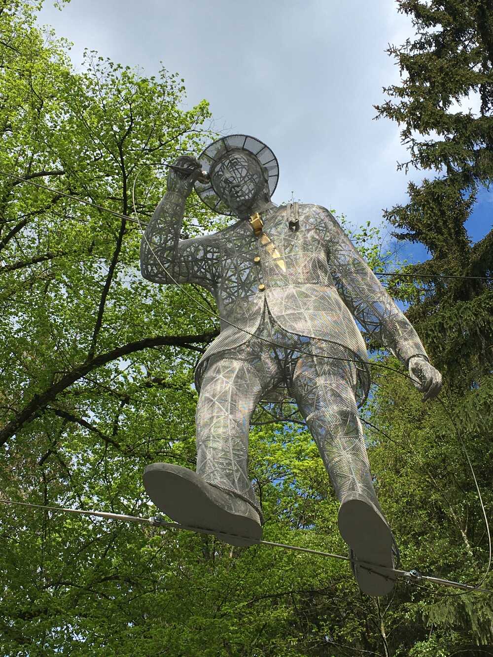 Filligrane Edelstahlgitter Grossskulptur, eine von dreien die ĂĽber dem Skulpturenweg zum Open Air Theater in Bad Elster an Seilen verspannt zu entdecken gibt. Illuminiert bei Nacht stimmen sie auf den Kulturellen Abend auf der BĂĽhne ein.