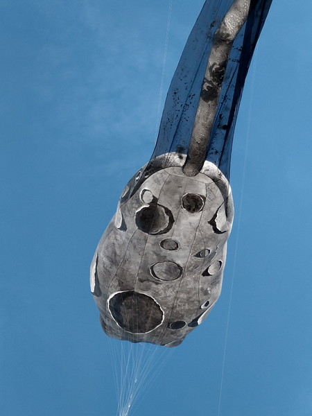 Stabloser, 3-dimensionaler Drachen aus Spinnakertuch, Organza und Schnur. Malerei auf Spinnakertuch.