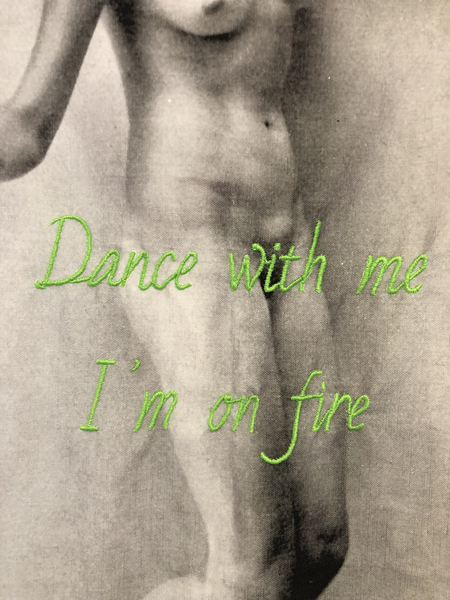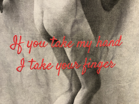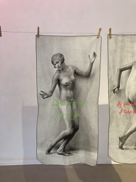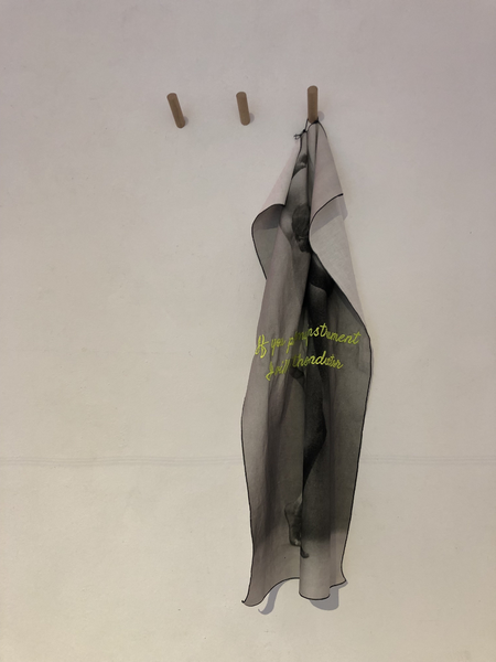 Installation mit Küchenhandtüchern und Neonleuchtschrift