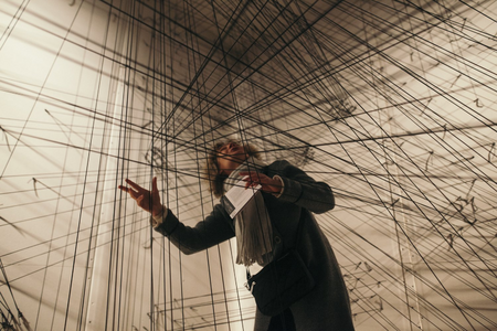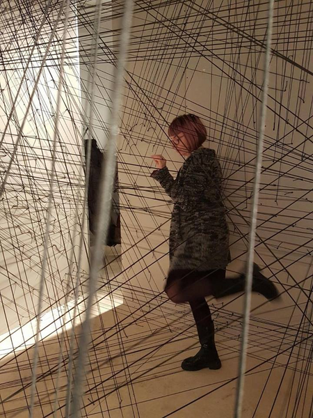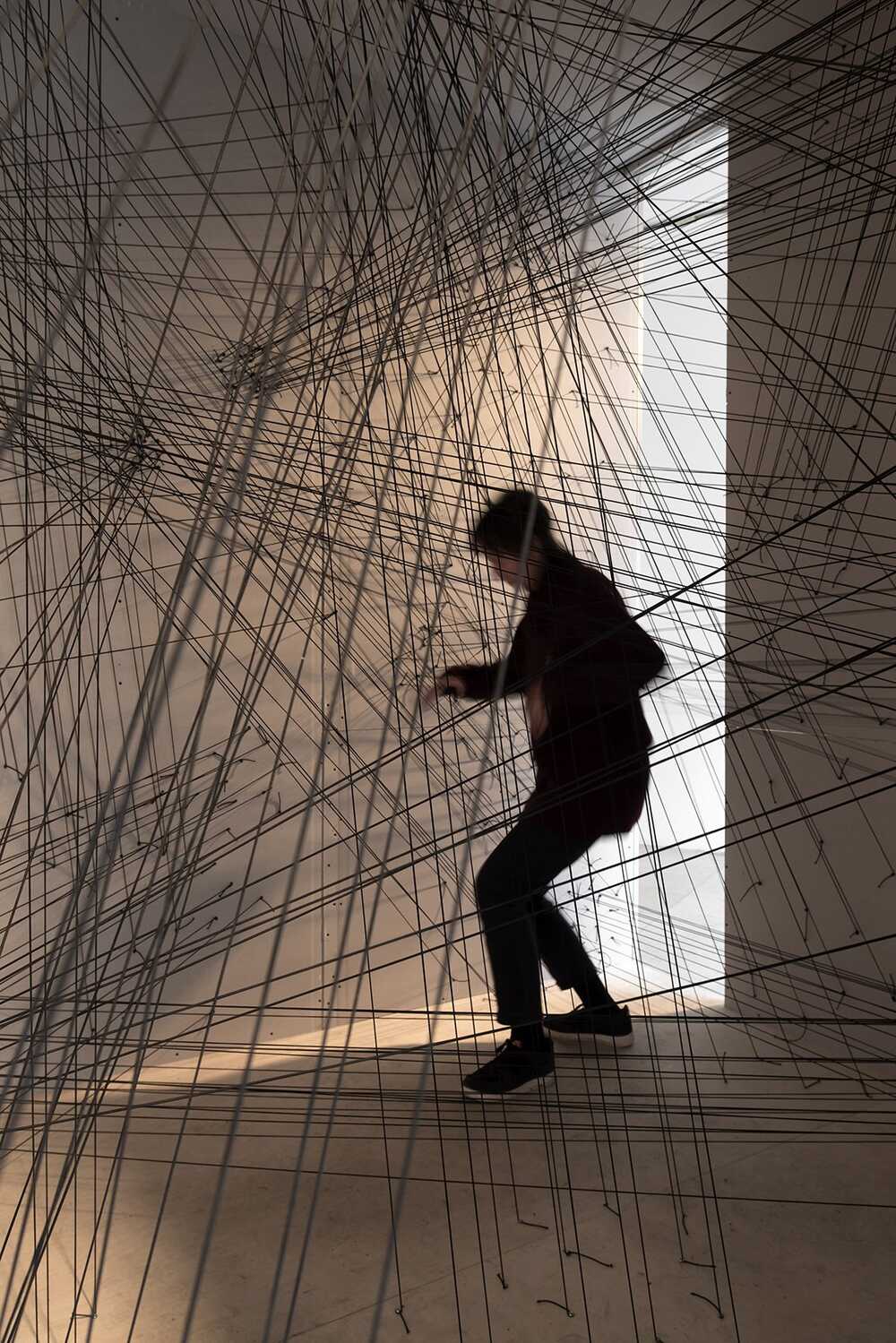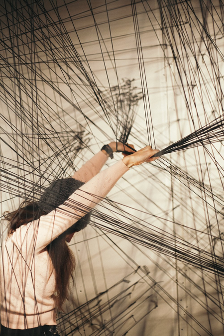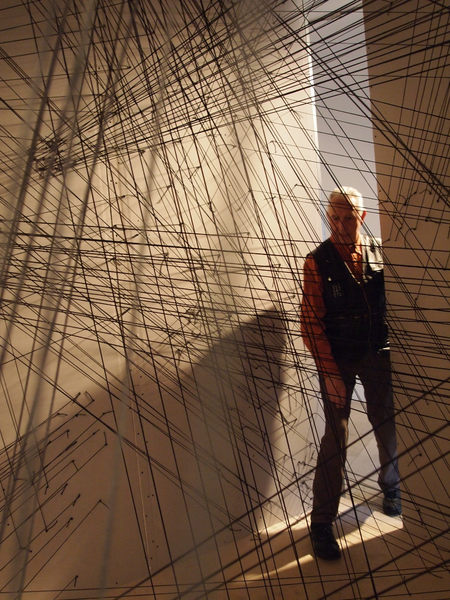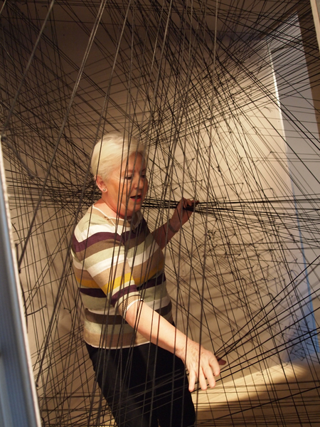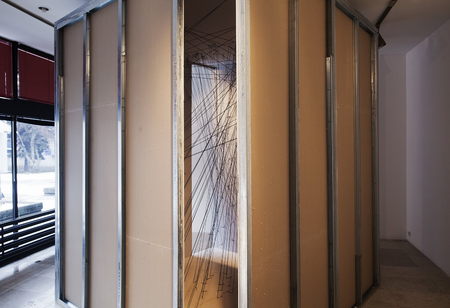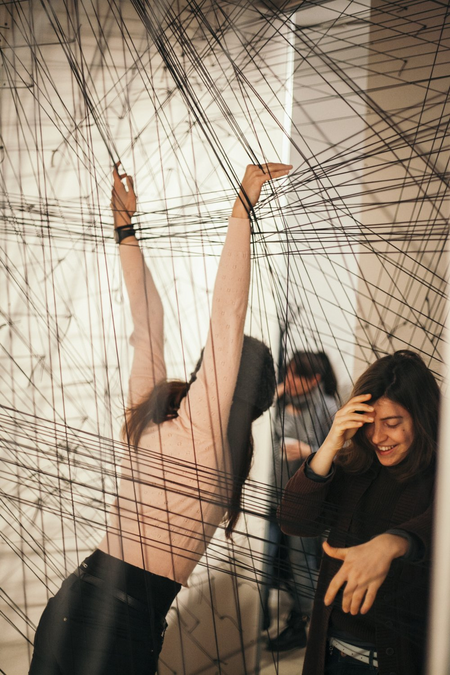interactive sculptural installation by Marina Bauer, (gypsum board construction, rubber bands)