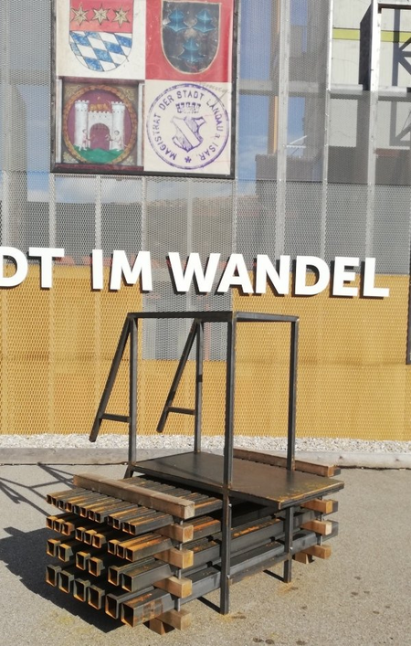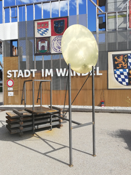 StadtKunstBausteine, Aichach. Ein Projekt der Weiterführung in Laufe von 4 Monaten mit 4 Künstlern 1. Projekt „ Stahllieferung“ Giussani, Augsburg, 2. Projekt - 1. Metarmophose Florian Fiener, Augsburg „ und endlich eine erhöhte Übersicht“, 3. Projekt - 2. Metarmophose, Antje Sträter „ Gesucht: Wagenlenker - im Laufe der Zeit“. Das 4. Projekt, die 3. Metarmophose erfolgt am 10. September durch Jürgen Krass, Sainbach/Aichach.